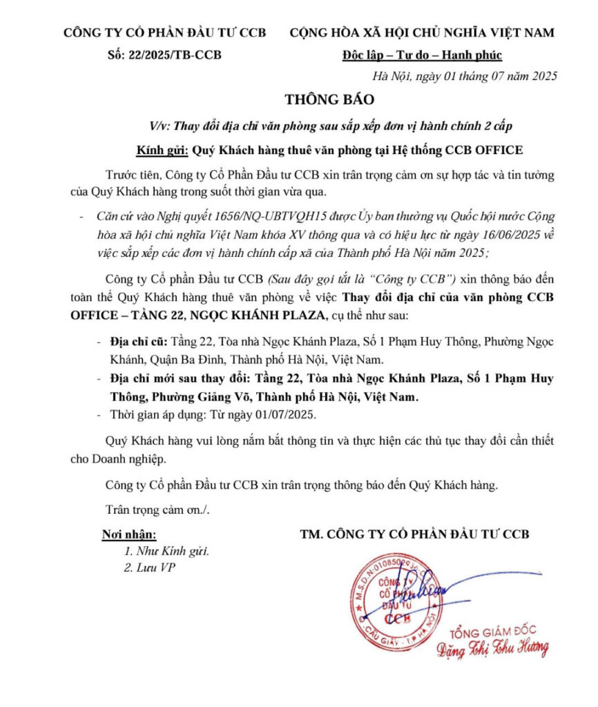 Công ty Cổ phần Đầu tư CCB (Sau đây gọi tắt là “Công ty CCB”) xin thông báo đến toàn thể Quý Khách hàng thuê văn phòng về việc Thay đổi địa chỉ của văn phòng CCB OFFICE – TÀNG 22, NGỌC KHÁNH PLAZA, cụ thể như sau: